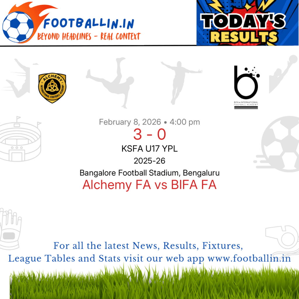Alchemy FA defeated BIFA FA 3-0 on Feb 8, 2026 in the KSFA U17 YPL at Bangalore Football Stadium, Bengaluru, in a commanding display.
