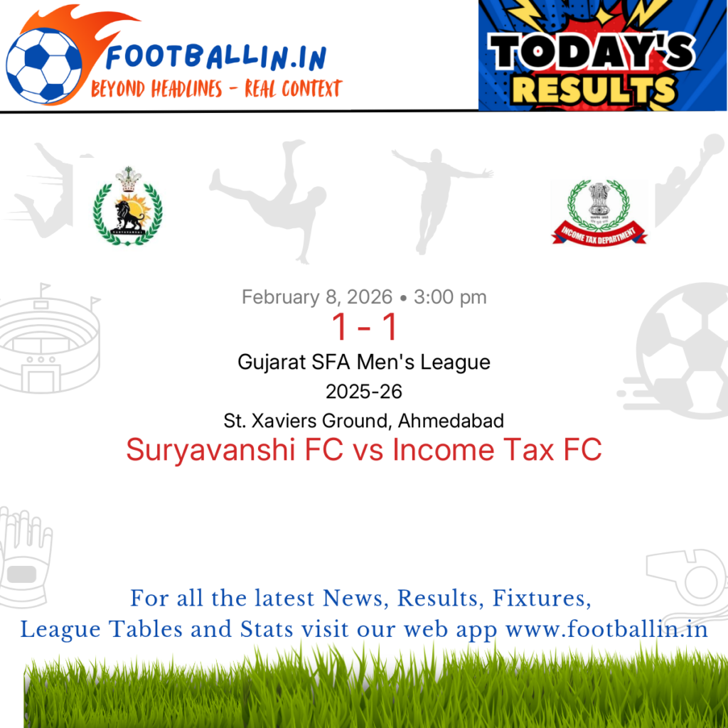 Suryavanshi FC and Income Tax FC drew 1-1 on Feb 8, 2026 in the Gujarat SFA Men's League at St. Xaviers Ground, Ahmedabad, after a evenly fought battle.