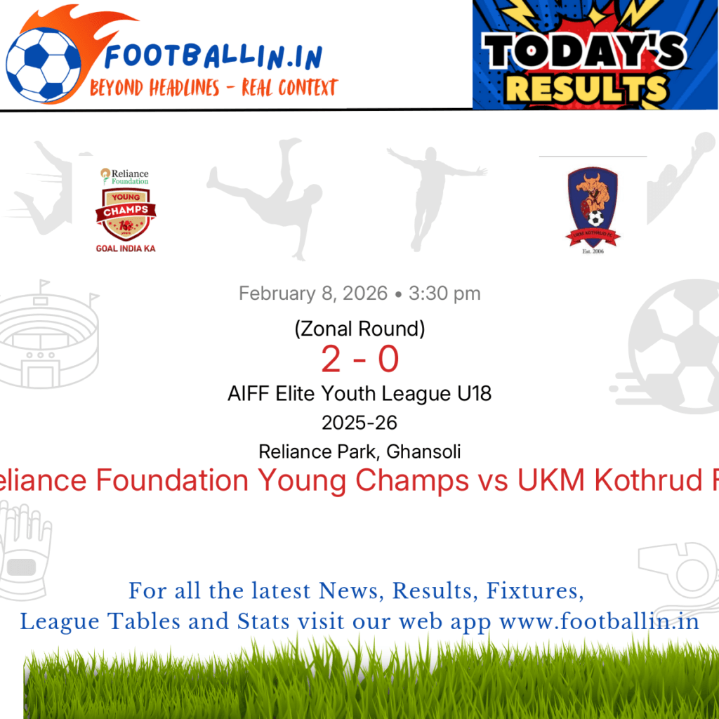 Reliance Foundation Young Champs defeated UKM Kothrud FC 2-0 on Feb 8, 2026 in the Zonal Round of the AIFF Elite Youth League U18 at Reliance Park, Ghansoli, in a tense encounter.