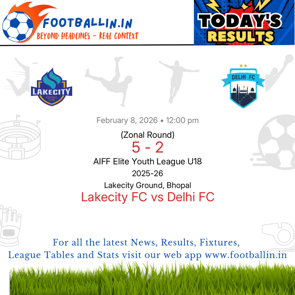 Lakecity FC defeated Delhi FC 5-2 on Feb 8, 2026 in the Zonal Round of the AIFF Elite Youth League U18 at Lakecity Ground, Bhopal, in a convincing win.