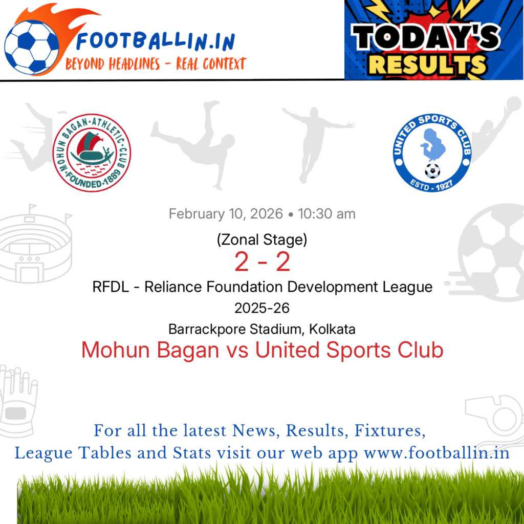 Mohun Bagan and United Sports Club drew 2-2 on Feb 10, 2026 in the Zonal Stage of the RFDL – Reliance Foundation Development League at Barrackpore Stadium, Kolkata, after a evenly fought battle.