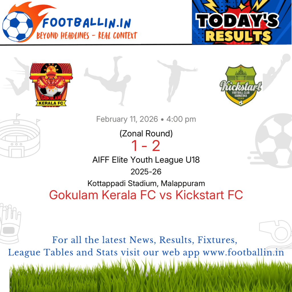 Kickstart FC defeated Gokulam Kerala FC 2-1 on Feb 11, 2026 in the Zonal Round of the AIFF Elite Youth League U18 at Kottappadi Stadium, Malappuram, in a tense encounter.
