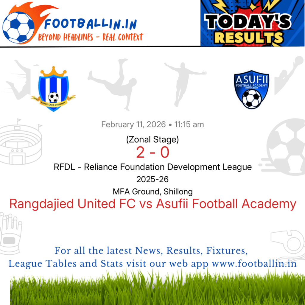 Rangdajied United FC defeated Asufii Football Academy 2-0 on Feb 11, 2026 in the Zonal Stage of the RFDL – Reliance Foundation Development League at MFA Ground, Shillong, in a closely-fought battle.