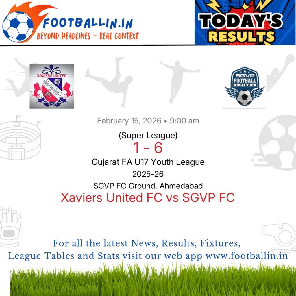 ⚽📊 League Table • Top Scorers • Statistics 📈⚽ SGVP FC defeated Xaviers United FC 6-1 on Feb 15, 2026 in the Super League of the Gujarat FA U17 Youth League at SGVP FC Ground, Ahmedabad, in a total rout. Phusammayum Taj Ahamed delivered a tidy double strike for SGVP FC in 13’ and 42’. […]