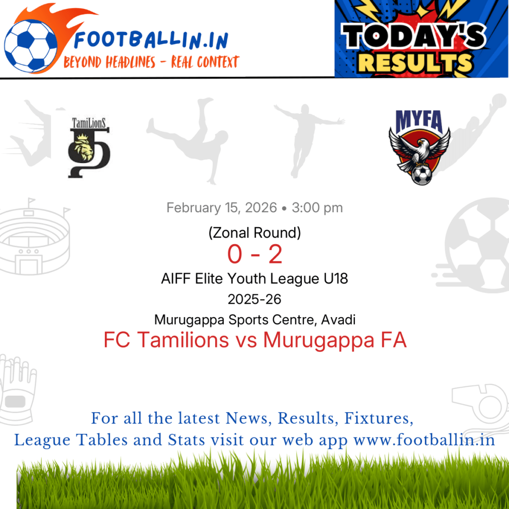 ⚽📊 League Table • Top Scorers • Statistics 📈⚽ Murugappa FA defeated FC Tamilions 2-0 on Feb 15, 2026 in the Zonal Round of the AIFF Elite Youth League U18 at Murugappa Sports Centre, Avadi, in a closely-fought battle. Devarsh S put Murugappa FA in front in the 42’. Praveen Nayan made it more comfortable […]