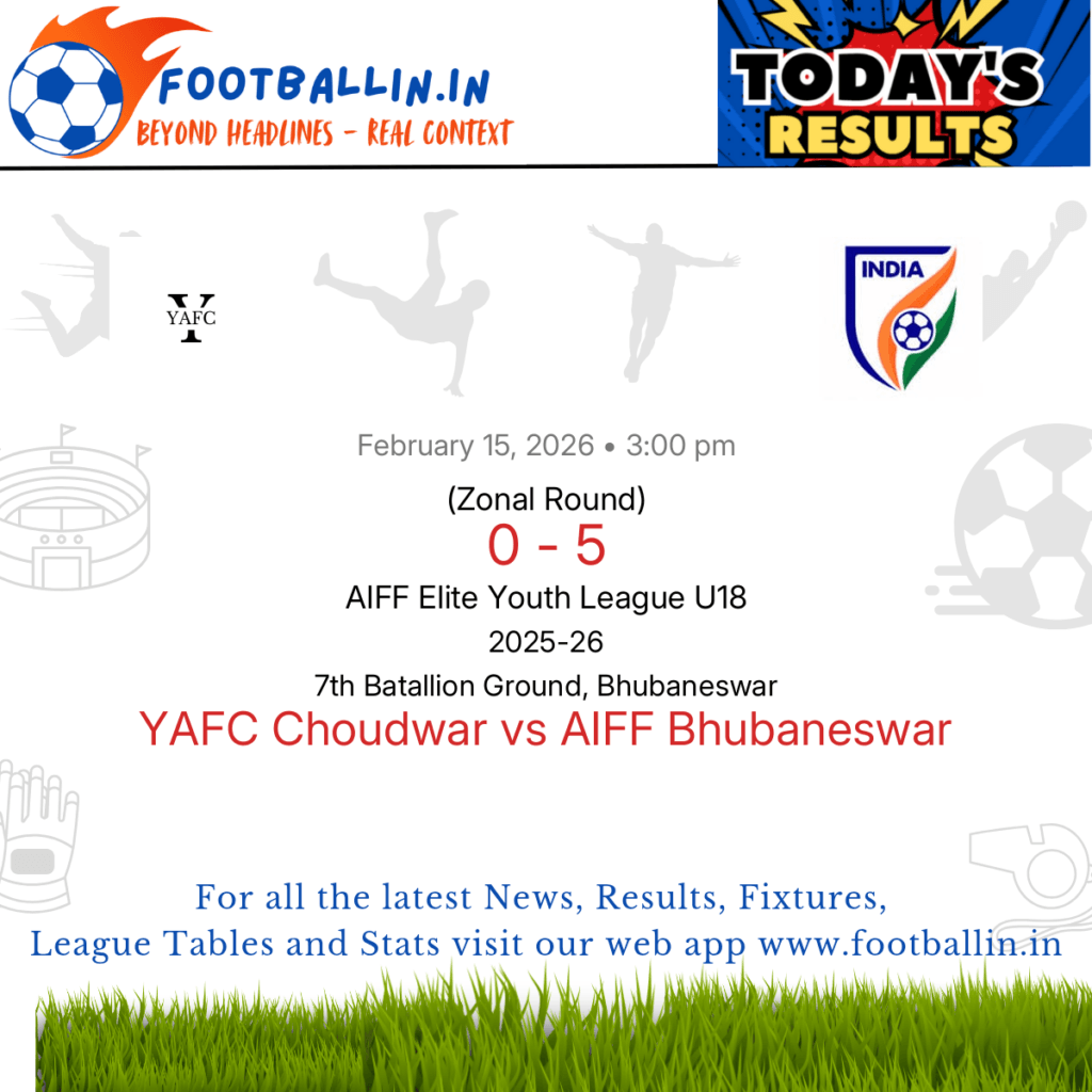 ⚽📊 League Table • Top Scorers • Statistics 📈⚽ AIFF Bhubaneswar defeated YAFC Choudwar 5-0 on Feb 15, 2026 in the Zonal Round of the AIFF Elite Youth League U18 at 7th Batallion Ground, Bhubaneswar, in a one-sided demolition. Lalrinsanga put AIFF Bhubaneswar in front in the 2’. Tinex Ningombam netted a memorable hat-trick for […]