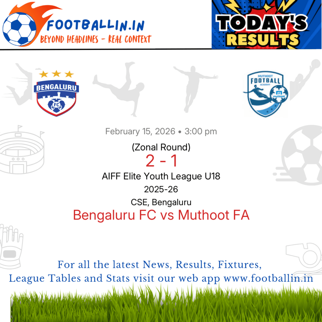 ⚽📊 League Table • Top Scorers • Statistics 📈⚽ Bengaluru FC defeated Muthoot FA 2-1 on Feb 15, 2026 in the Zonal Round of the AIFF Elite Youth League U18 at CSE, Bengaluru, in a hard-fought match. Gladson M Cherian put Muthoot FA in front in the 1’. Cyrus Abhilash equalised for Bengaluru FC in […]