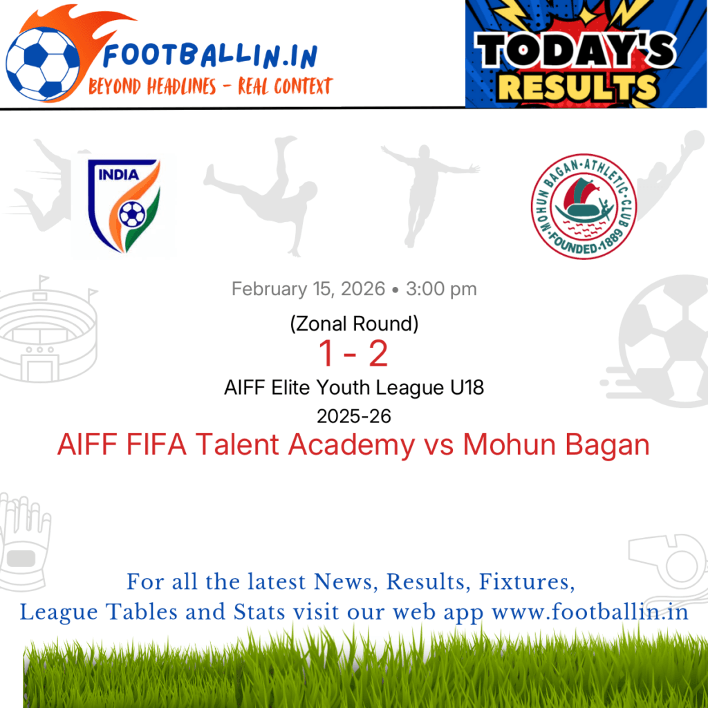 ⚽📊 League Table • Top Scorers • Statistics 📈⚽ Mohun Bagan defeated AIFF FIFA Talent Academy 2-1 on Feb 15, 2026 in the Zonal Round of the AIFF Elite Youth League U18, in a tense encounter. Aheibam Ronandev put AIFF FIFA Talent Academy in front in the 7’. Lungoulal Kipgen levelled for Mohun Bagan in […]