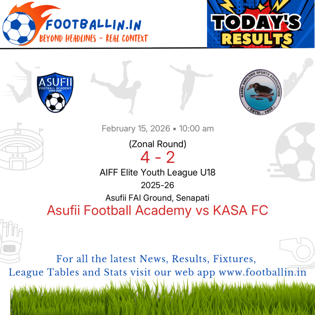 ⚽📊 League Table • Top Scorers • Statistics 📈⚽ Asufii Football Academy defeated KASA FC 4-2 on Feb 15, 2026 in the Zonal Round of the AIFF Elite Youth League U18 at Asufii FAI Ground, Senapati, in a tense encounter. Ningmesh Rongpi put KASA FC in front in the 36’. Lamminthang Kipgen produced a clinical […]
