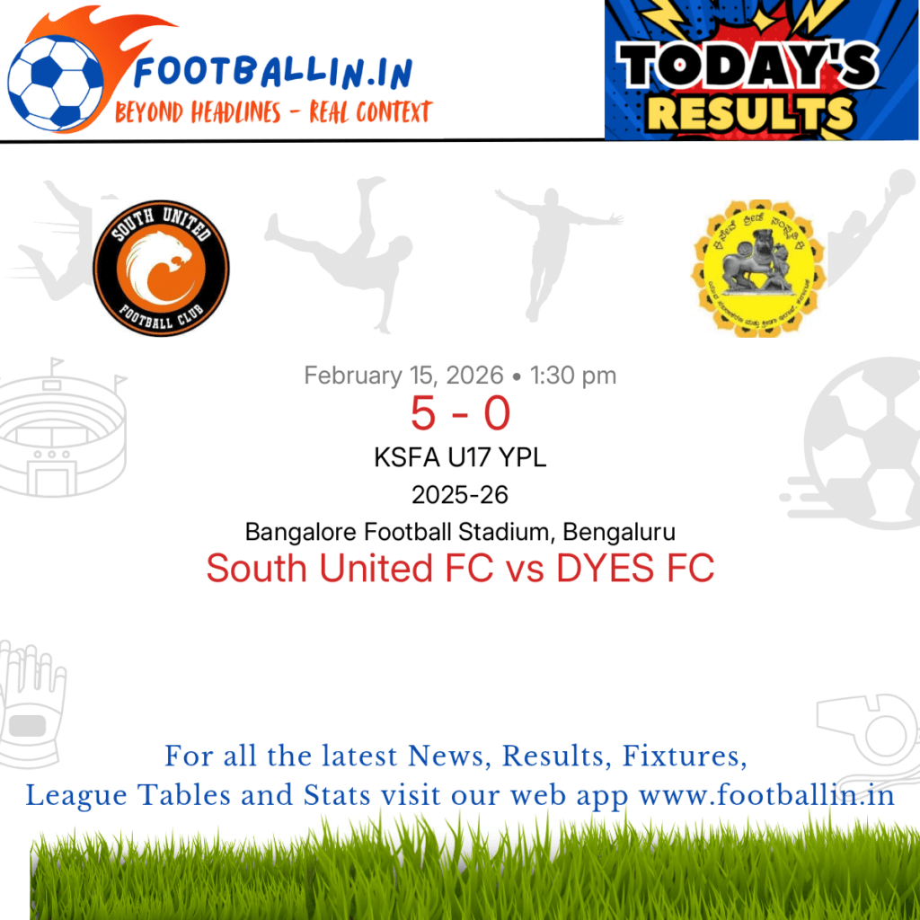 ⚽📊 League Table • Top Scorers • Statistics 📈⚽ South United FC defeated DYES FC 5-0 on Feb 15, 2026 in the KSFA U17 YPL at Bangalore Football Stadium, Bengaluru, in a total rout. Abhilash T H hit a fine brace for South United FC in 5’ and 62’. Satminlun Khongsai produced a clinical brace […]