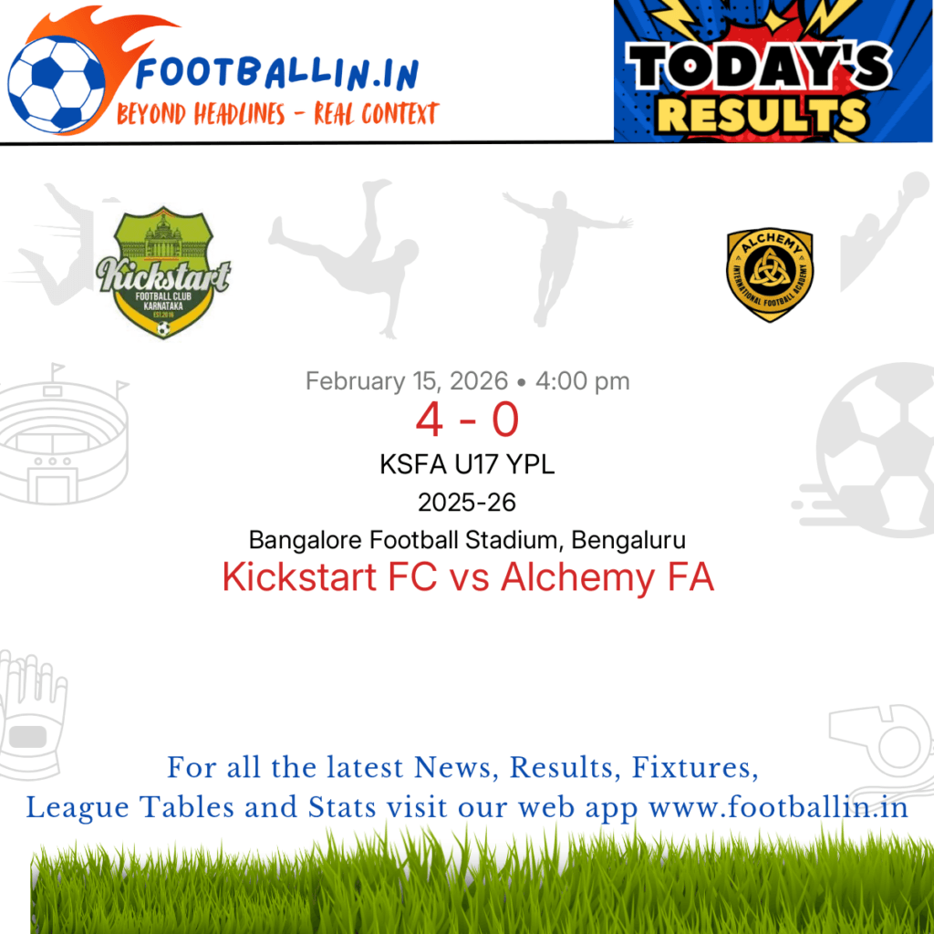 ⚽📊 League Table • Top Scorers • Statistics 📈⚽ Kickstart FC defeated Alchemy FA 4-0 on Feb 15, 2026 in the KSFA U17 YPL at Bangalore Football Stadium, Bengaluru, in a landslide win. A Ananda Asir fired a stunning hat-trick for Kickstart FC. Ganesh made it more comfortable for Kickstart FC. The comprehensive scoreline underlined […]
