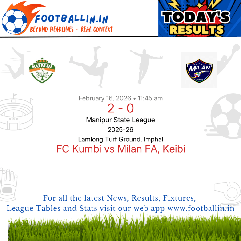 ⚽📊 League Table • Top Scorers • Statistics 📈⚽ FC Kumbi defeated Milan FA, Keibi 2-0 on Feb 16, 2026 in the Manipur State League at Lamlong Turf Ground, Imphal, in a tense encounter. Sorokhaibam Robert Singh put FC Kumbi in front in the 21’. Soram Sumit Singh stretched FC Kumbi's lead in the 90+4’. […]