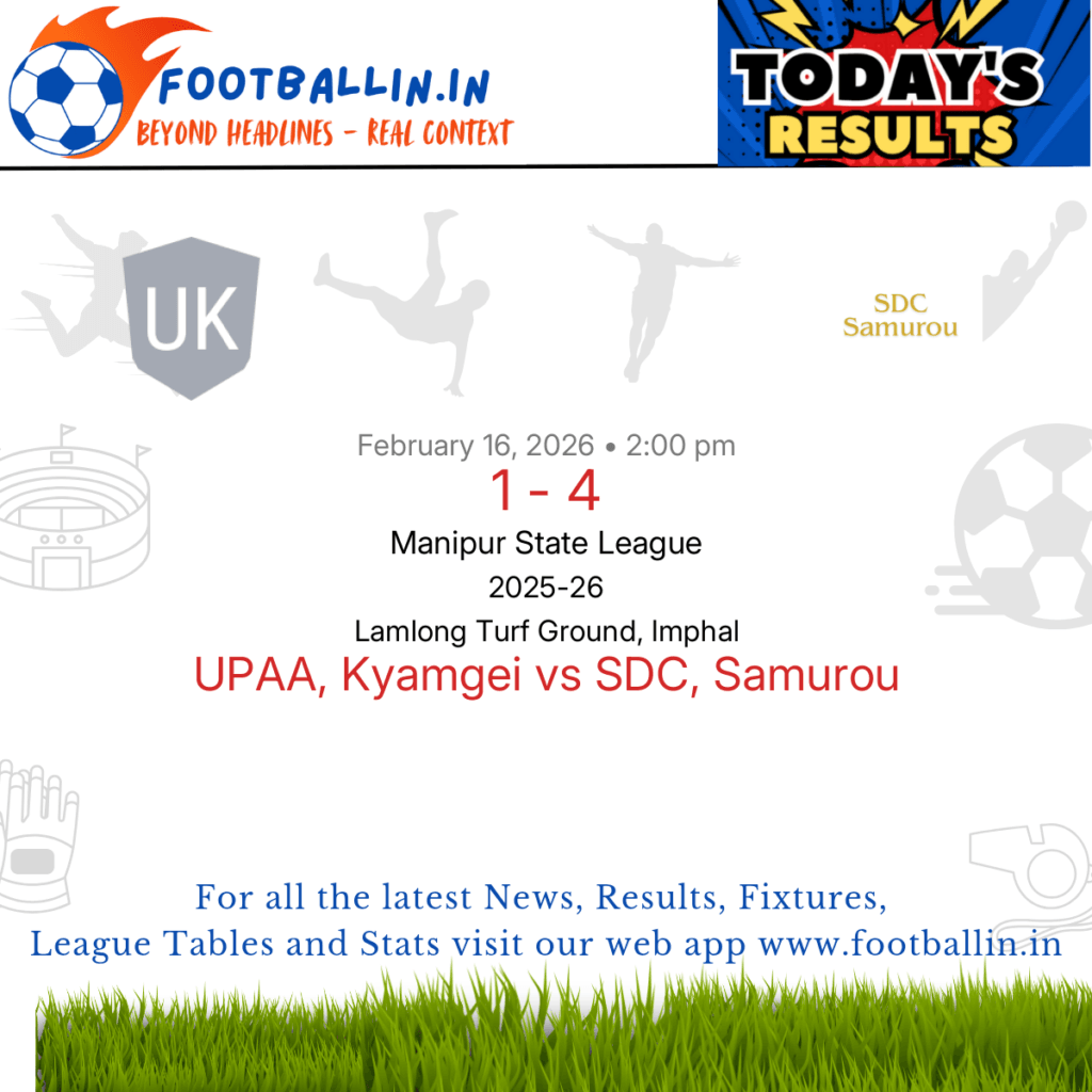 ⚽📊 League Table • Top Scorers • Statistics 📈⚽ SDC, Samurou defeated UPAA, Kyamgei 4-1 on Feb 16, 2026 in the Manipur State League at Lamlong Turf Ground, Imphal, in a heavily favored encounter. Aimson Athokpam hit a fine brace for SDC, Samurou in 13’ and 51’. Kishan Naorem stretched SDC, Samurou's lead in the […]