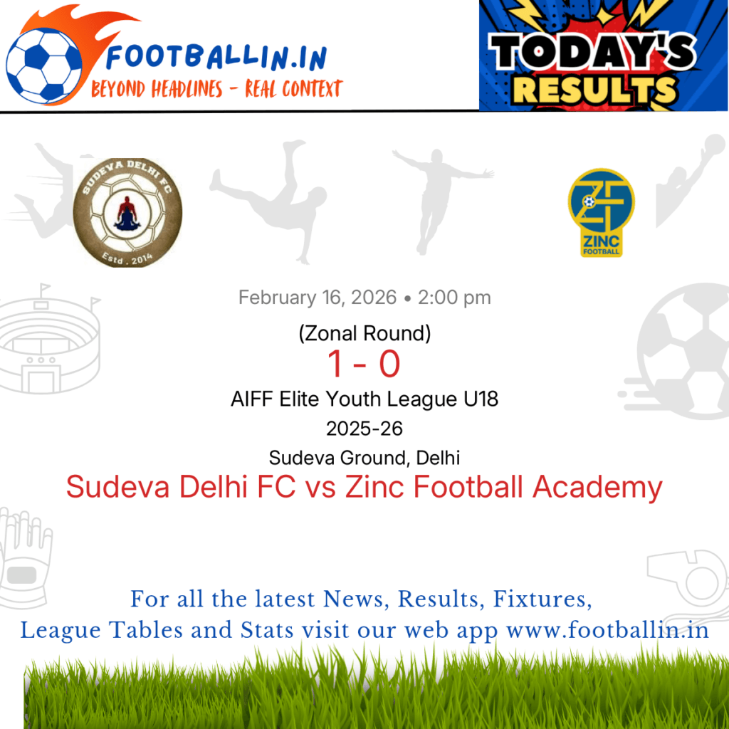 ⚽📊 League Table • Top Scorers • Statistics 📈⚽ Sudeva Delhi FC defeated Zinc Football Academy 1-0 on Feb 16, 2026 in the Zonal Round of the AIFF Elite Youth League U18 at Sudeva Ground, Delhi, in a hard-fought match. Md Mahmud Sami struck the decisive goal in the 64’, securing the win for Sudeva […]