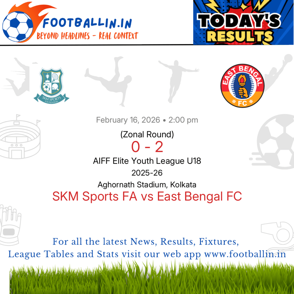 ⚽📊 League Table • Top Scorers • Statistics 📈⚽ East Bengal FC defeated SKM Sports FA 2-0 on Feb 16, 2026 in the Zonal Round of the AIFF Elite Youth League U18 at Aghornath Stadium, Kolkata, in a competitive clash. Pritam Gain put East Bengal FC in front in the 52’. Letgousang Kipgen made it […]