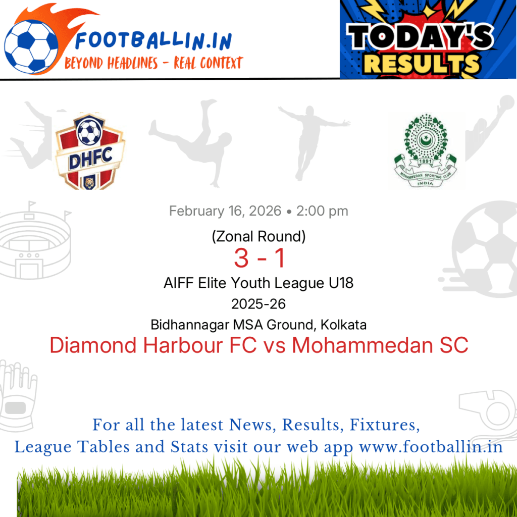 ⚽📊 League Table • Top Scorers • Statistics 📈⚽ Diamond Harbour FC defeated Mohammedan SC 3-1 on Feb 16, 2026 in the Zonal Round of the AIFF Elite Youth League U18 at Bidhannagar MSA Ground, Kolkata, in a competitive clash. Sahil Mondal put Diamond Harbour FC in front in the 7’. Suman Oraon scored a […]