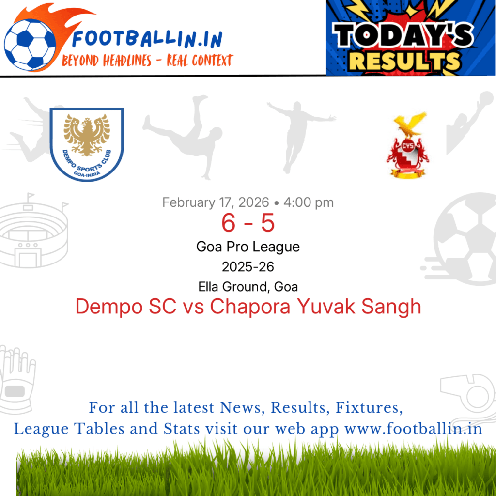 Dempo SC defeated Chapora Yuvak Sangh 6-5 on Feb 17, 2026 in the Goa Pro League at Ella Ground, Goa, in a closely-fought battle.