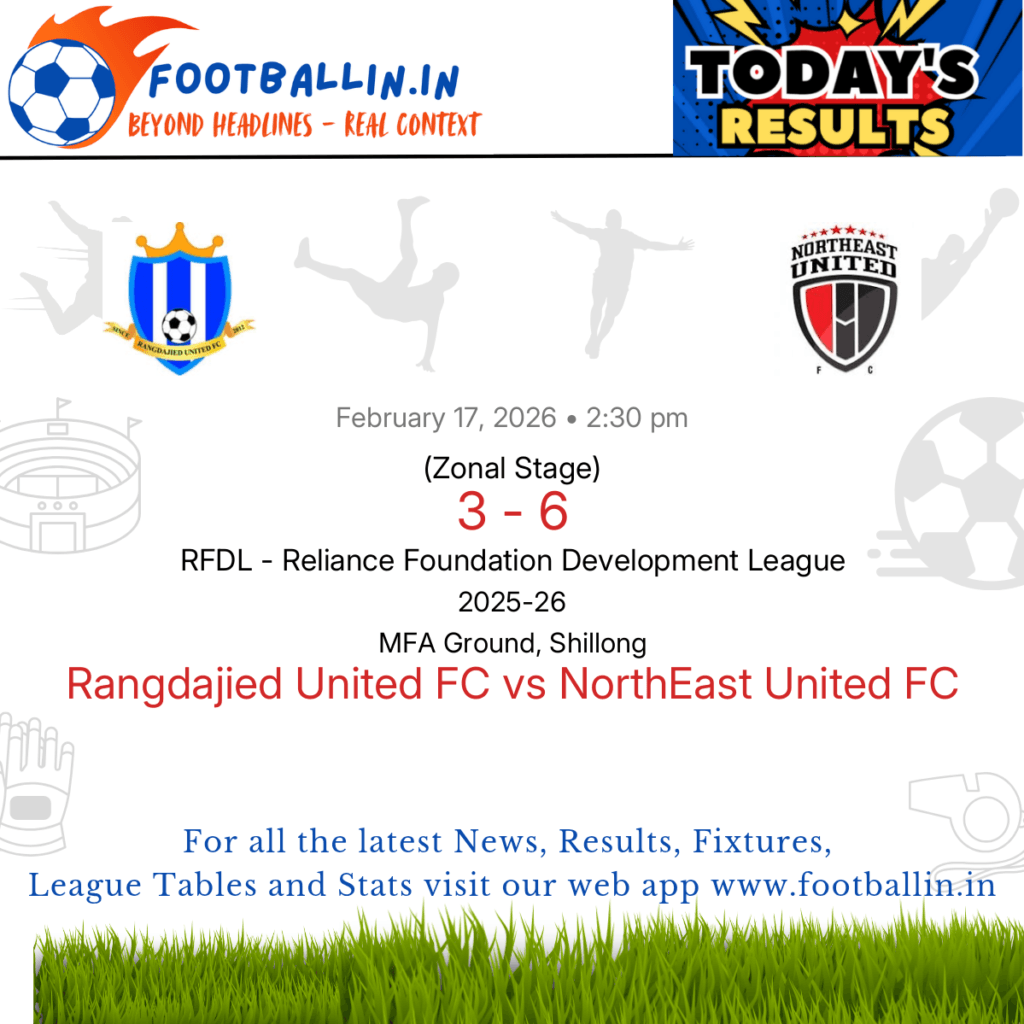 NorthEast United FC defeated Rangdajied United FC 6-3 on Feb 17, 2026 in the Zonal Stage of the RFDL – Reliance Foundation Development League at MFA Ground, Shillong, in a commanding display.