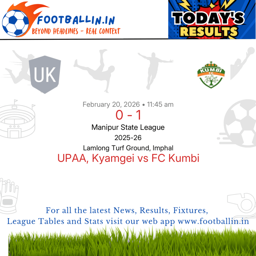 FC Kumbi defeated UPAA, Kyamgei 1-0 on Feb 20, 2026 in the Manipur State League at Lamlong Turf Ground, Imphal, in a tense encounter.