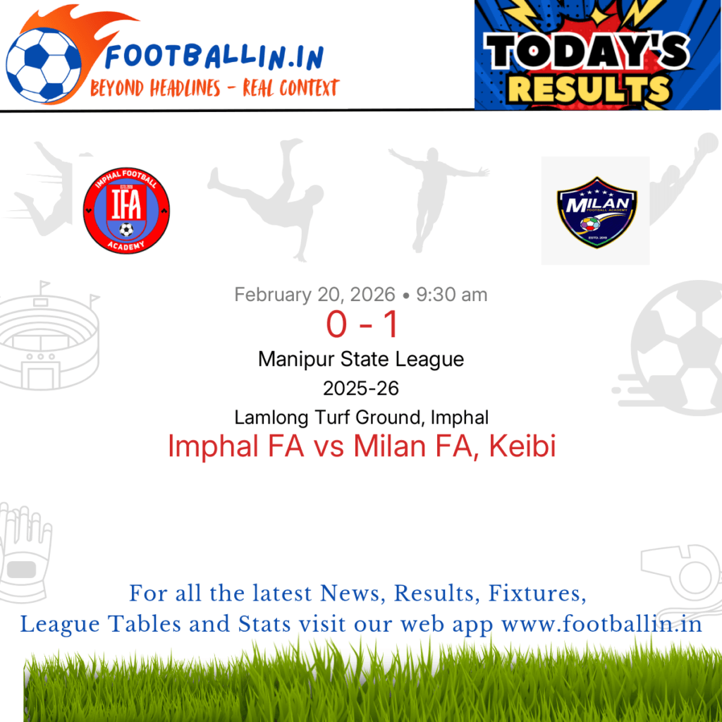 Milan FA, Keibi defeated Imphal FA 1-0 on Feb 20, 2026 in the Manipur State League at Lamlong Turf Ground, Imphal, in a closely-fought battle.
