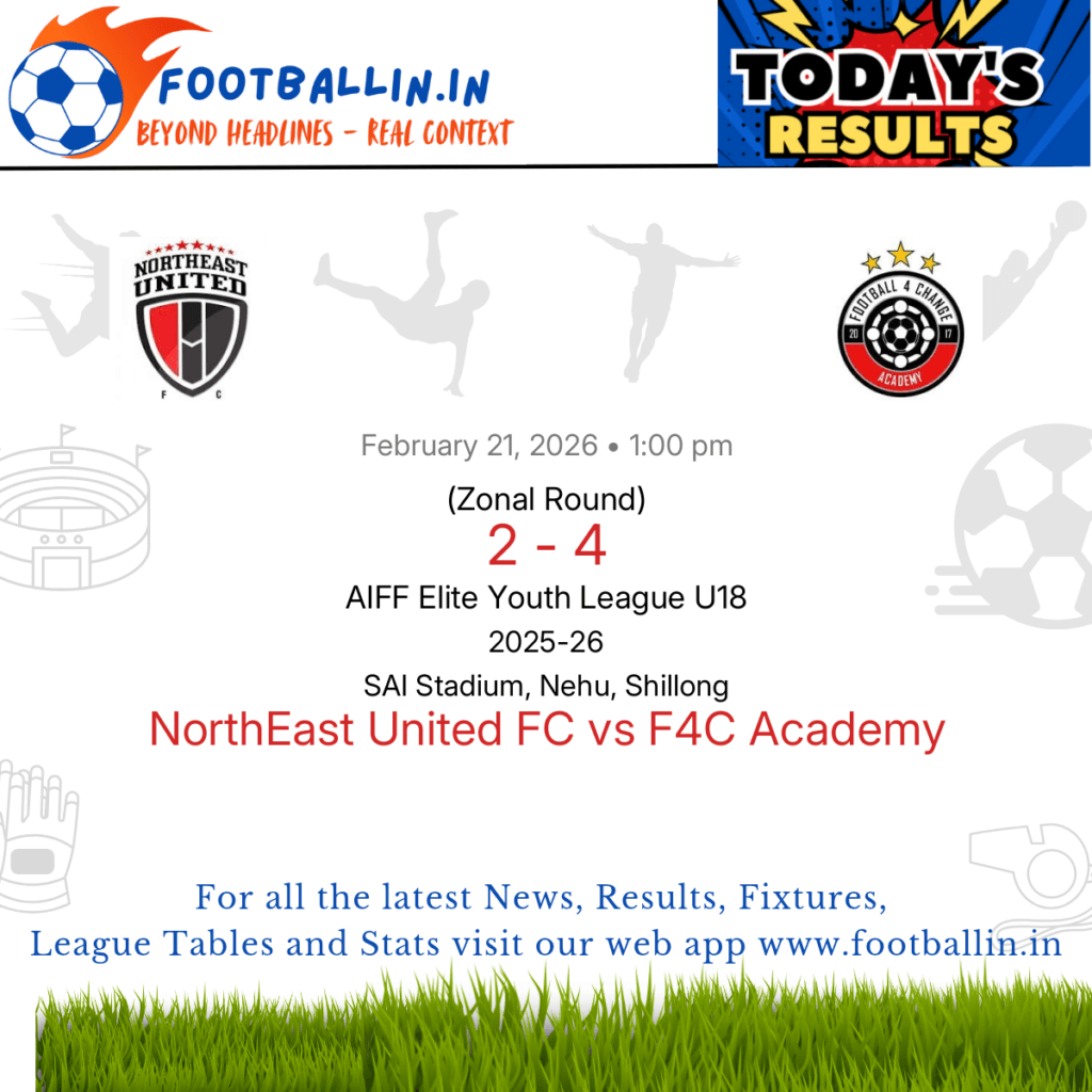 F4C Academy defeated NorthEast United FC 4-2 on Feb 21, 2026 in the Zonal Round of the AIFF Elite Youth League U18 at SAI Stadium, Nehu, Shillong, in a hard-fought match.