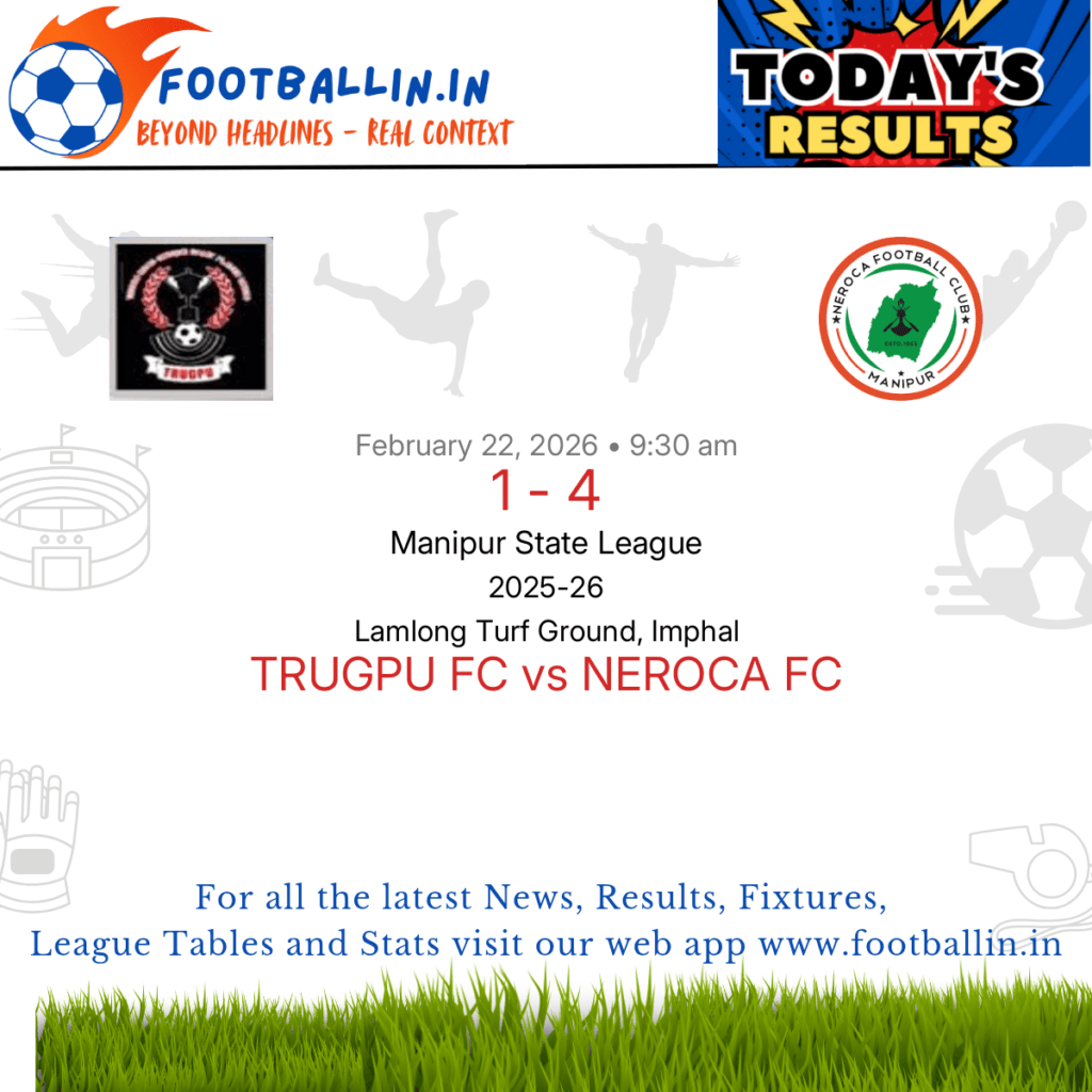 ⚽📊 League Table • Top Scorers • Statistics 📈⚽ NEROCA FC defeated TRUGPU FC 4-1 on Feb 22, 2026 in the Manipur State League at Lamlong Turf Ground, Imphal, in a heavily favored encounter. Mustafa Aribam put NEROCA FC in front in the 40’. Naorem Alex Singh equalised for TRUGPU FC in the 48’. Muhammed […]