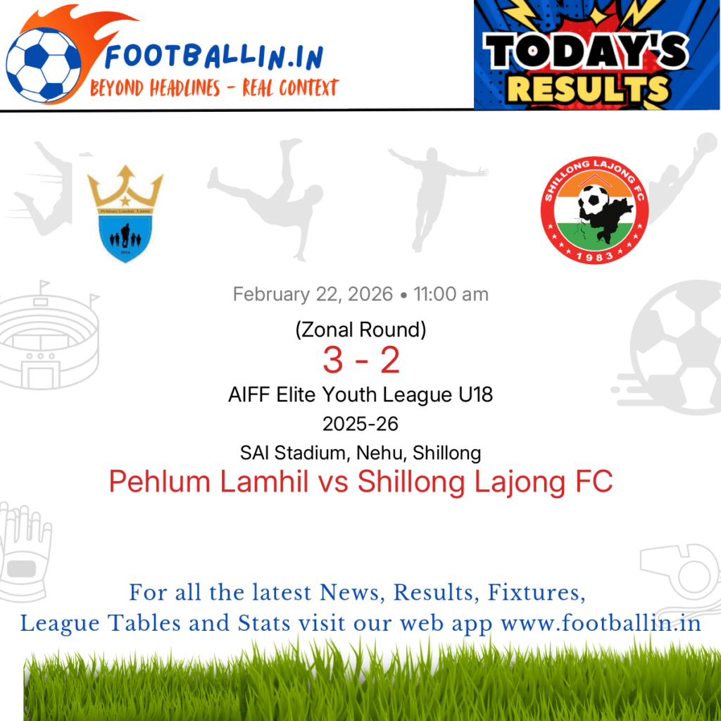 ⚽📊 League Table • Top Scorers • Statistics 📈⚽ Pehlum Lamhil defeated Shillong Lajong FC 3-2 on Feb 22, 2026 in the Zonal Round of the AIFF Elite Youth League U18 at SAI Stadium, Nehu, Shillong, in a competitive clash. Meubaai Sumer put Shillong Lajong FC in front in the 1’. Hemgoulal Lupho produced a […]