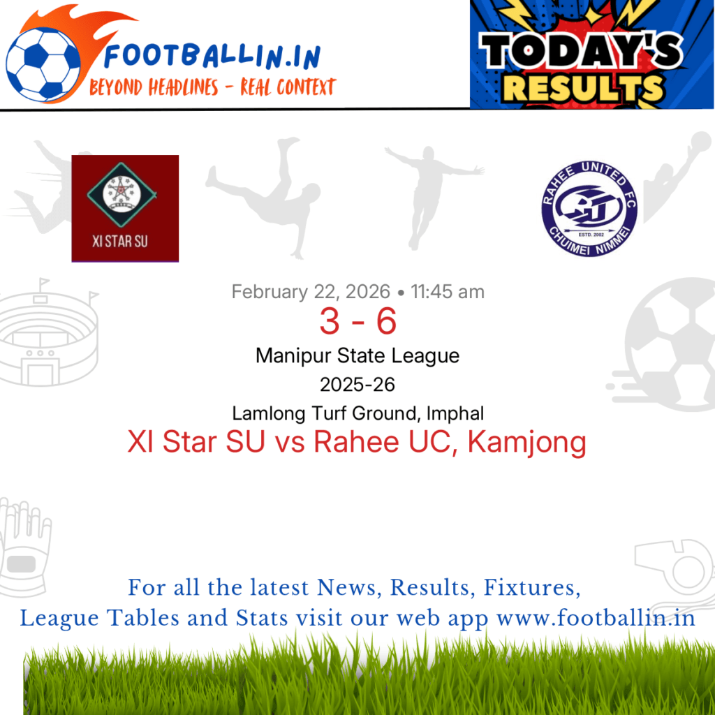 ⚽📊 League Table • Top Scorers • Statistics 📈⚽ Rahee UC, Kamjong defeated XI Star SU 6-3 on Feb 22, 2026 in the Manipur State League at Lamlong Turf Ground, Imphal, in a dominant performance. Moirangthem Abinash Singh put Rahee UC, Kamjong in front in the 12’. Sorokhaibam Navison Singh levelled for XI Star SU […]