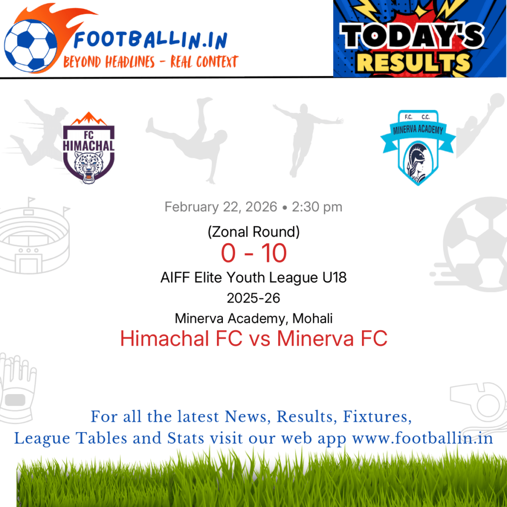 ⚽📊 League Table • Top Scorers • Statistics 📈⚽ Minerva FC defeated Himachal FC 10-0 on Feb 22, 2026 in the Zonal Round of the AIFF Elite Youth League U18 at Minerva Academy, Mohali, in a one-sided demolition. Zeeshan Anwar Lone hit a fine brace for Minerva FC in 7’ and 28’. Kartikay Singh added […]