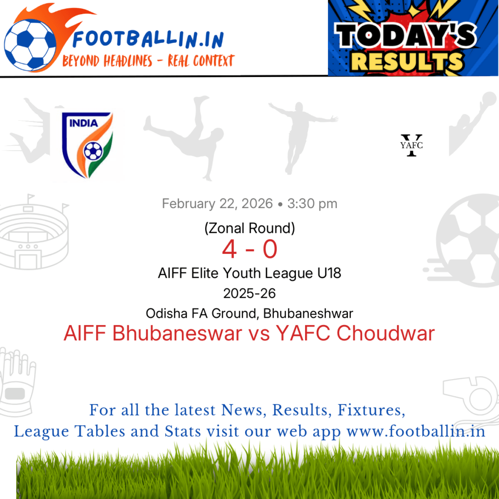 ⚽📊 League Table • Top Scorers • Statistics 📈⚽ AIFF Bhubaneswar defeated YAFC Choudwar 4-0 on Feb 22, 2026 in the Zonal Round of the AIFF Elite Youth League U18 at Odisha FA Ground, Bhubaneshwar, in a total rout. Saikhom Felex Meitei struck a sharp double for AIFF Bhubaneswar in 2’ and 12’. Lalrinsanga added […]