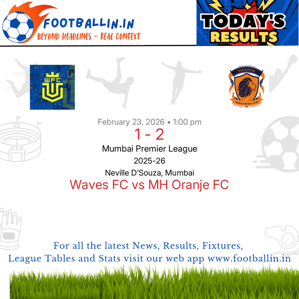⚽📊 League Table • Top Scorers • Statistics 📈⚽ MH Oranje FC defeated Waves FC 2-1 on Feb 23, 2026 in the Mumbai Premier League at Neville D’Souza, Mumbai, in a closely-fought battle. Chrispin Rayan put MH Oranje FC in front in the 40’. Sachit S Bhanji levelled for Waves FC in the 74’. Mohammed […]