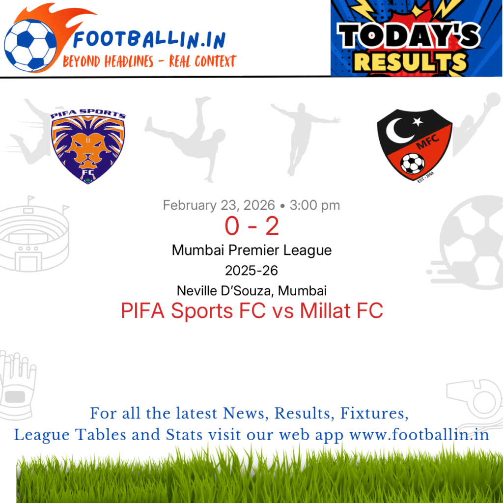 ⚽📊 League Table • Top Scorers • Statistics 📈⚽ Millat FC defeated PIFA Sports FC 2-0 on Feb 23, 2026 in the Mumbai Premier League at Neville D’Souza, Mumbai, in a hard-fought match. Keegan Pinto put Millat FC in front in the 14’. Roger Anthony extended Millat FC's lead in the 50’. #indianyouthfootball #indianfootball #indianwomenfootball […]