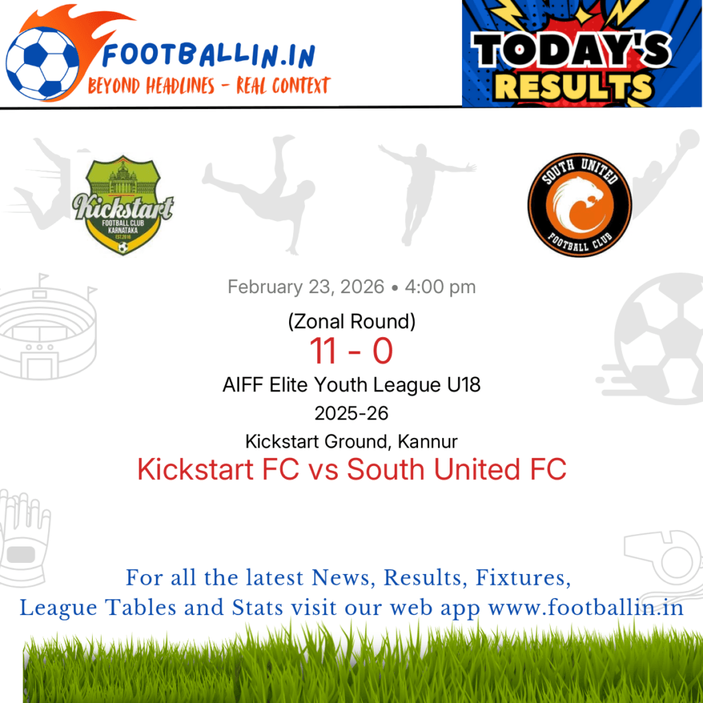 ⚽📊 League Table • Top Scorers • Statistics 📈⚽ Kickstart FC defeated South United FC 11-0 on Feb 23, 2026 in the Zonal Round of the AIFF Elite Youth League U18 at Kickstart Ground, Kannur, in a total rout. Deekshith K produced a superb hat-trick for Kickstart FC (4’, 10’, 30’, 45+1’, 50’). Kushal Rawal […]
