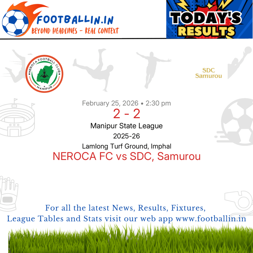 ⚽📊 League Table • Top Scorers • Statistics 📈⚽ NEROCA FC and SDC, Samurou drew 2-2 on Feb 25, 2026 in the Manipur State League at Lamlong Turf Ground, Imphal, after a competitive draw. Khundongbam Philips put NEROCA FC in front in the 1’. Mustafa Aribam stretched NEROCA FC's lead in the 35’. Longjam Sheitam […]