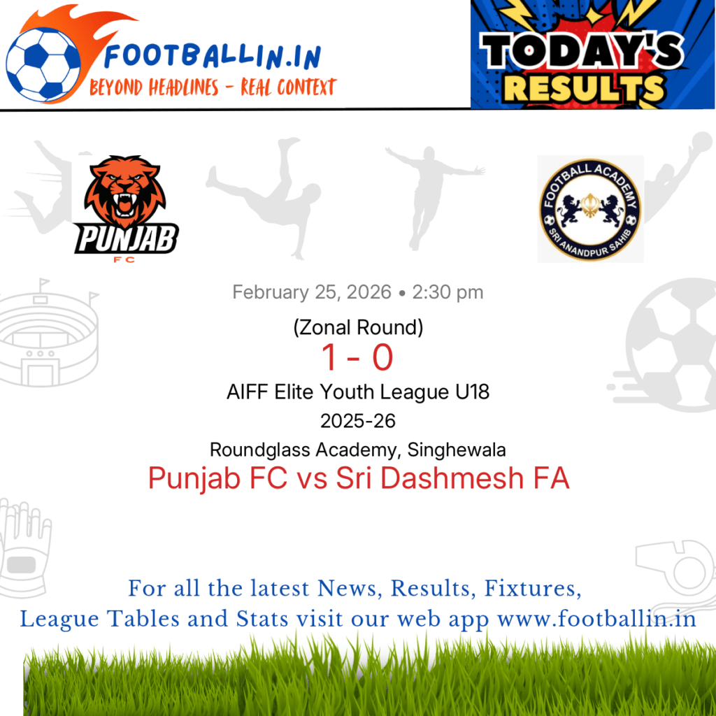 ⚽📊 League Table • Top Scorers • Statistics 📈⚽ Punjab FC defeated Sri Dashmesh FA 1-0 on Feb 25, 2026 in the Zonal Round of the AIFF Elite Youth League U18 at Roundglass Academy, Singhewala, in a hard-fought match. Roshan Soren's goal in the 81’ ultimately decided the contest, his single effort sealed the victory […]