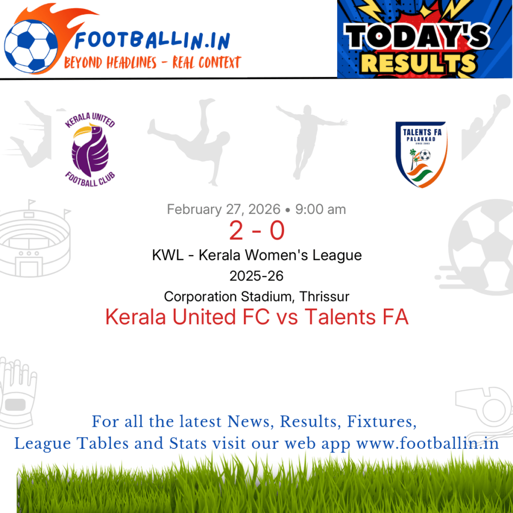 ⚽📊 League Table • Top Scorers • Statistics 📈⚽ Kerala United FC defeated Talents FA 2-0 on Feb 27, 2026 in the KWL – Kerala Women's League at Corporation Stadium, Thrissur, in a tense encounter. Vaishnavi E put Kerala United FC in front in the 27’. Shamila M further strengthened Kerala United FC's position in […]