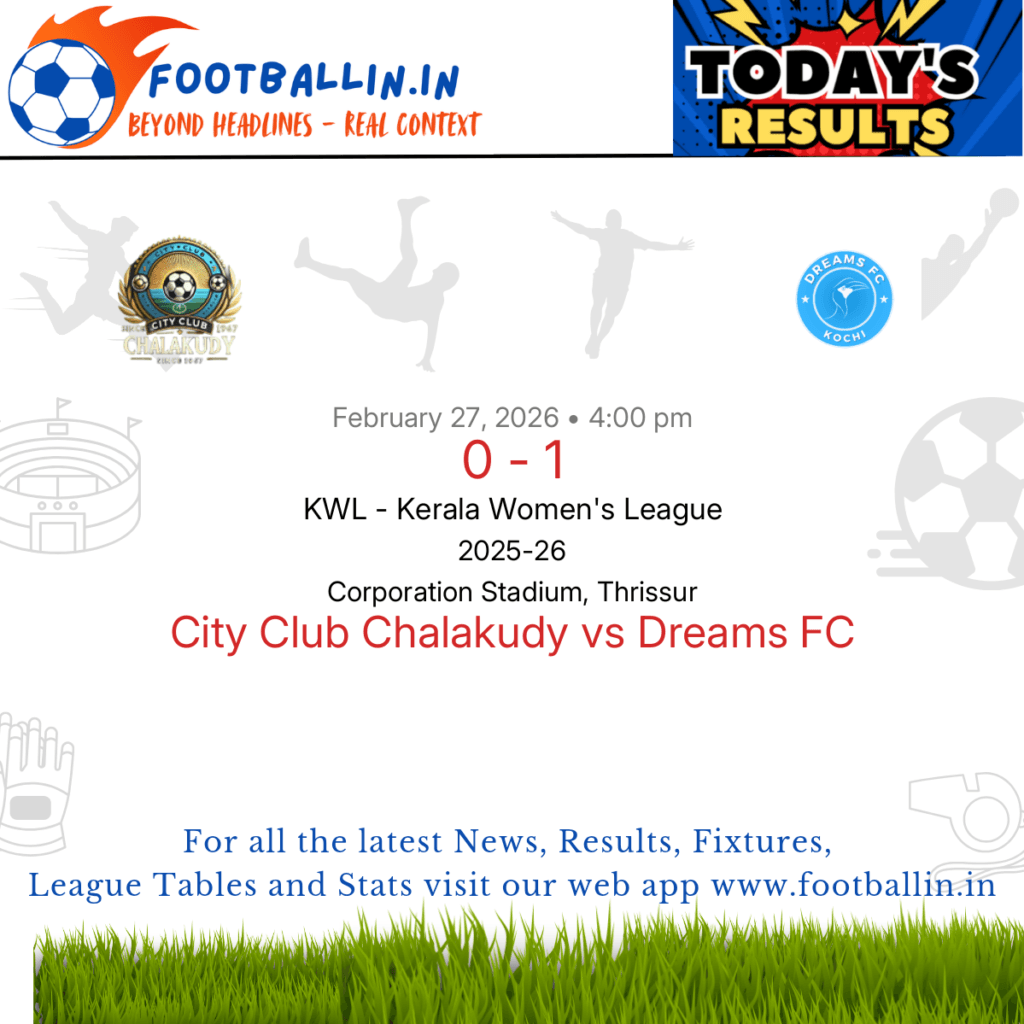 ⚽📊 League Table • Top Scorers • Statistics 📈⚽ Dreams FC defeated City Club Chalakudy 1-0 on Feb 27, 2026 in the KWL – Kerala Women's League at Corporation Stadium, Thrissur, in a hard-fought match. Bhagya Vinod's goal in the 79’ ultimately decided the contest, her single effort sealed the victory for Dreams FC. #indianyouthfootball […]