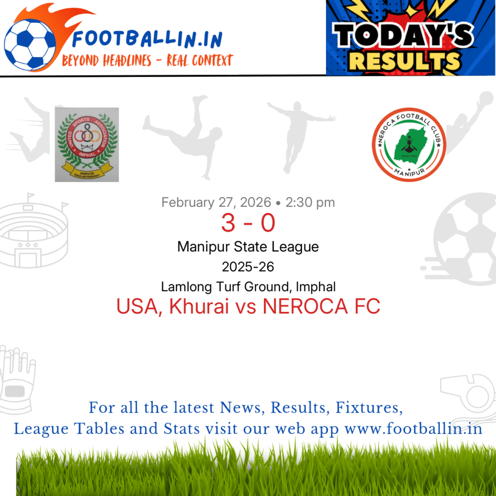 ⚽📊 League Table • Top Scorers • Statistics 📈⚽ USA, Khurai defeated NEROCA FC 3-0 on Feb 27, 2026 in the Manipur State League at Lamlong Turf Ground, Imphal, in a heavily favored encounter. Thoudam Pravash Singh scored a brace for USA, Khurai in 33’ and 80’. Ashangbam Bhaskar Singh extended USA, Khurai's lead in […]