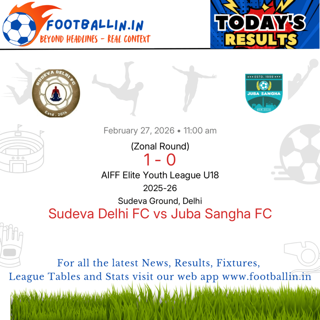 ⚽📊 League Table • Top Scorers • Statistics 📈⚽ Sudeva Delhi FC defeated Juba Sangha FC 1-0 on Feb 27, 2026 in the Zonal Round of the AIFF Elite Youth League U18 at Sudeva Ground, Delhi, in a tense encounter. Mahamed Sami's goal in the 18’ ultimately decided the contest, his single effort sealed the […]