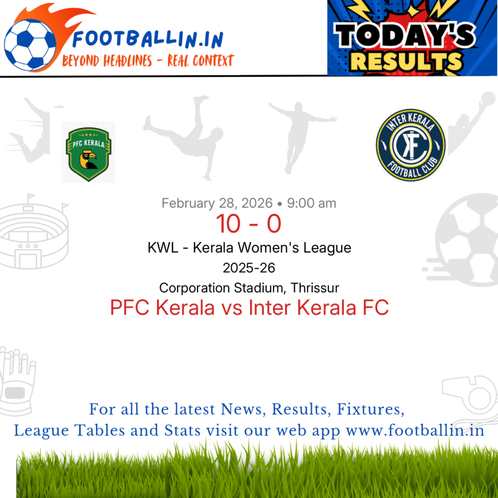 ⚽📊 League Table • Top Scorers • Statistics 📈⚽ PFC Kerala defeated Inter Kerala FC 10-0 on Feb 28, 2026 in the KWL – Kerala Women's League at Corporation Stadium, Thrissur, in a landslide win. Vara Lakshmi S netted a memorable hat-trick for PFC Kerala (4’, 24’, 30’, 85’). Nandana Krishnan hit a fine brace […]