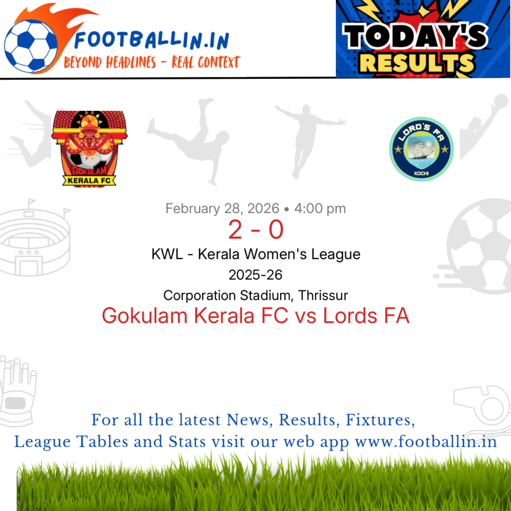 ⚽📊 League Table • Top Scorers • Statistics 📈⚽ Gokulam Kerala FC defeated Lords FA 2-0 on Feb 28, 2026 in the KWL – Kerala Women's League at Corporation Stadium, Thrissur, in a hard-fought match. Muskan Subba put Gokulam Kerala FC in front in the 3’. Heigrujam Daya Devi further strengthened Gokulam Kerala FC's position […]