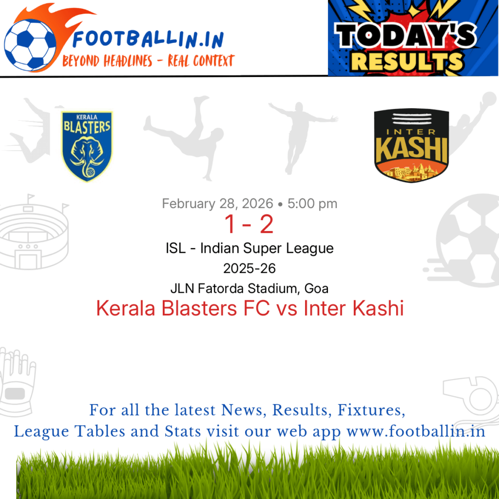 ⚽📊 League Table • Top Scorers • Statistics 📈⚽ Inter Kashi defeated Kerala Blasters FC 2-1 on Feb 28, 2026 in the ISL – Indian Super League at JLN Fatorda Stadium, Goa, in a competitive clash. Nauris Petkevicius put Inter Kashi in front in the 34’. Alfred P Moya made it more comfortable for Inter […]