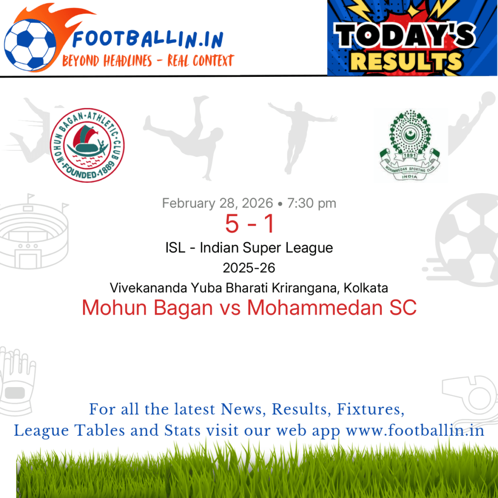 ⚽📊 League Table • Top Scorers • Statistics 📈⚽ Mohun Bagan defeated Mohammedan SC 5-1 on Feb 28, 2026 in the ISL – Indian Super League at Vivekananda Yuba Bharati Krirangana, Kolkata, in a total rout. Lalthankima put Mohammedan SC in front in the 12’. Robson A Silva hit a fine brace for Mohun Bagan […]