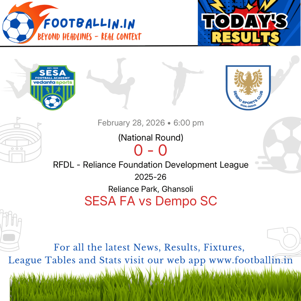 ⚽📊 League Table • Top Scorers • Statistics 📈⚽ SESA FA and Dempo SC drew 0-0 on Feb 28, 2026 in the National Round of the RFDL – Reliance Foundation Development League at Reliance Park, Ghansoli, after a closely matched encounter. #indianyouthfootball #indianfootball #indianwomenfootball #indianfootballleague #footballin #rfdlreliancefoundationdevelopmentleague #sesafa #demposc