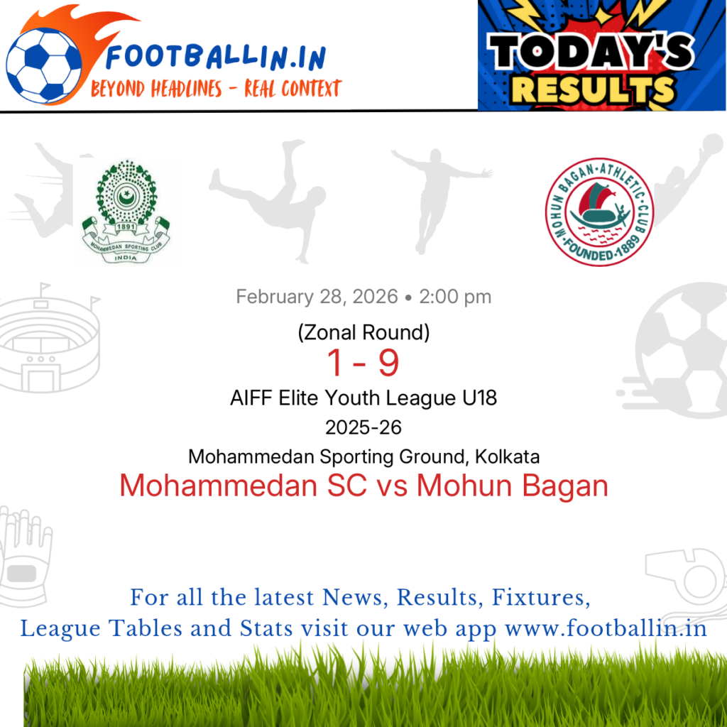 ⚽📊 League Table • Top Scorers • Statistics 📈⚽ Mohun Bagan defeated Mohammedan SC 9-1 on Feb 28, 2026 in the Zonal Round of the AIFF Elite Youth League U18 at Mohammedan Sporting Ground, Kolkata, in a landslide win. Lungoulal Kipgen hit a fine brace for Mohun Bagan in 10’ and 84’. Debashish Roy kept […]