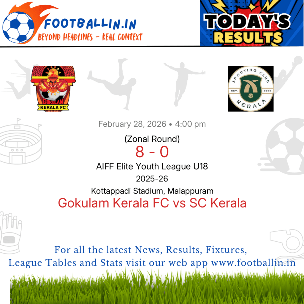 ⚽📊 League Table • Top Scorers • Statistics 📈⚽ Gokulam Kerala FC defeated SC Kerala 8-0 on Feb 28, 2026 in the Zonal Round of the AIFF Elite Youth League U18 at Kottappadi Stadium, Malappuram, in a total rout. Sheril S Thomas delivered a tidy double strike for Gokulam Kerala FC in 9’ and 32’. […]