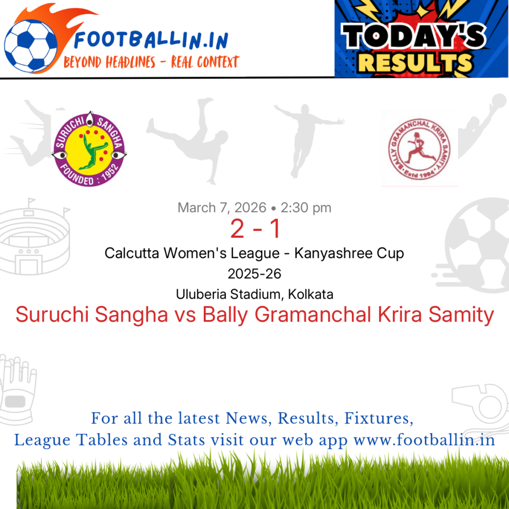 ⚽📊 League Table • Top Scorers • Statistics 📈⚽ Suruchi Sangha defeated Bally Gramanchal Krira Samity 2-1 on Mar 7, 2026 in the Calcutta Women's League – Kanyashree Cup at Uluberia Stadium, Kolkata, in a closely-fought battle. Barsha Mahakud put Bally Gramanchal Krira Samity in front in the 36’. Mamata Hansda equalised for Suruchi Sangha […]
