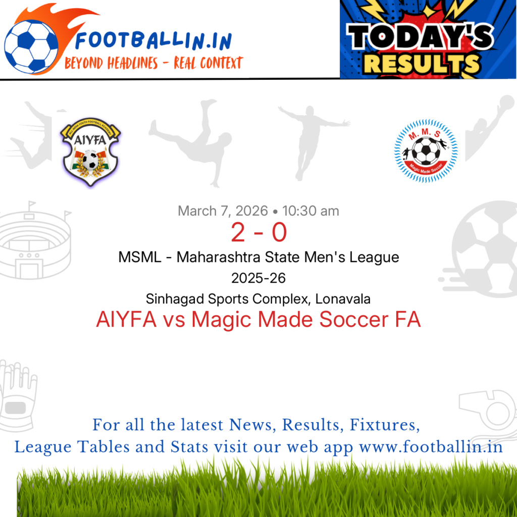 ⚽📊 League Table • Top Scorers • Statistics 📈⚽ AIYFA defeated Magic Made Soccer FA 2-0 on Mar 7, 2026 in the MSML – Maharashtra State Men's League at Sinhagad Sports Complex, Lonavala, in a hard-fought match. Jassim Naroo struck a sharp double for AIYFA in 59’ and 90+2’. #indianyouthfootball #indianfootball #indianwomenfootball #indianfootballleague #footballin #msmlmaharashtrastatemensleague […]