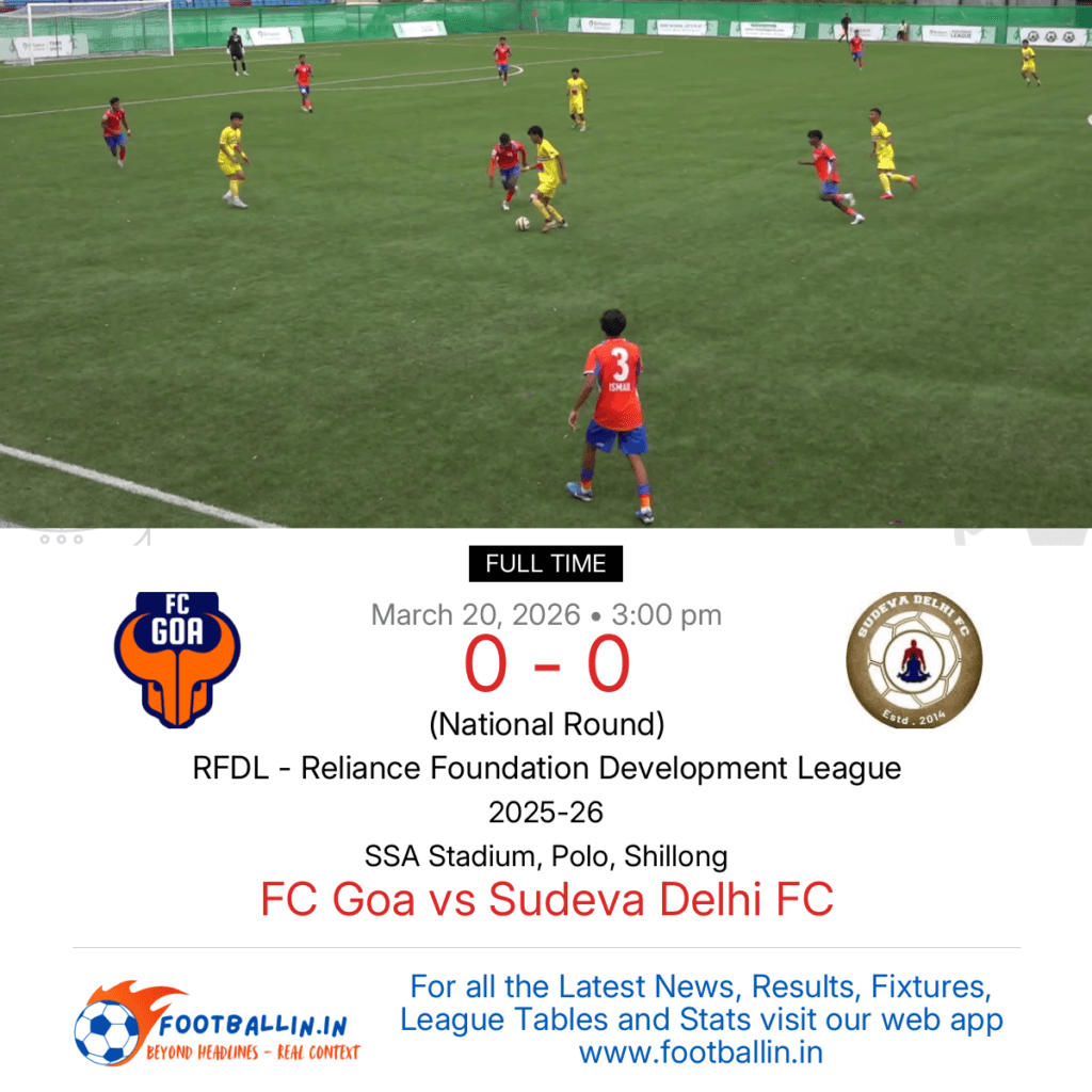 FC Goa and Sudeva Delhi FC drew 0-0 on Mar 20, 2026 in the National Round of the RFDL – Reliance Foundation Development League at SSA Stadium, Polo, Shillong, after a evenly fought battle.