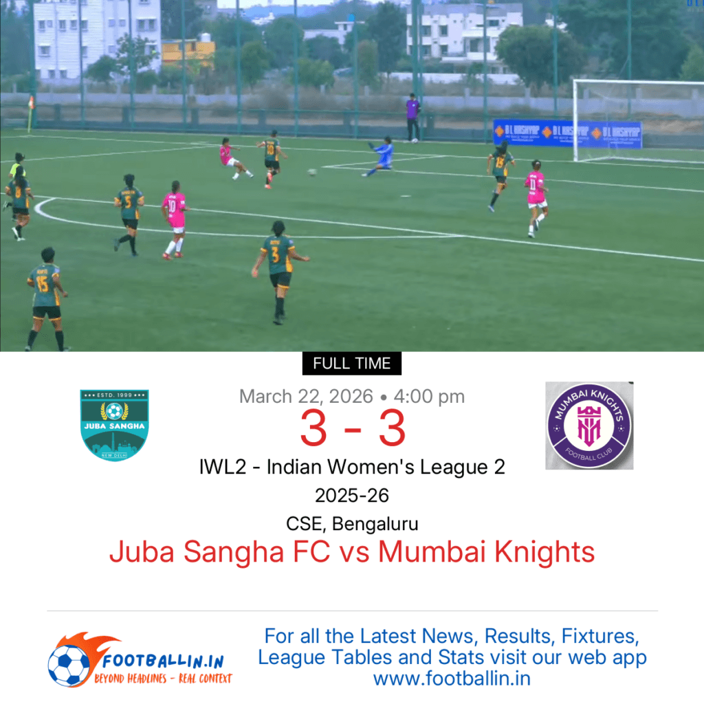 Juba Sangha FC and Mumbai Knights drew 3-3 on Mar 22, 2026 in the IWL2 – Indian Women's League 2 at CSE, Bengaluru, after a hard-fought stalemate.